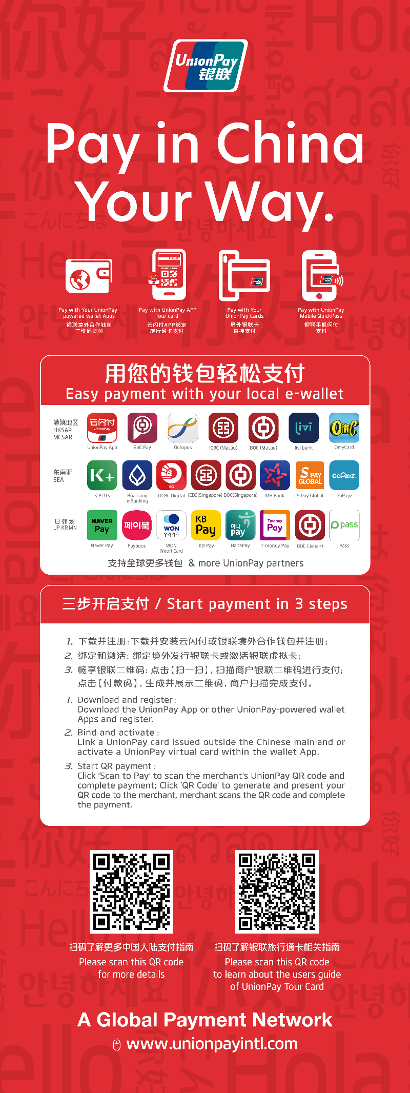 方式二:通(tōng)過境外(wài)移動支付工(gōng)具掃商戶提供的(de)銀(yín)聯二維碼進 行(xíng)支付。港澳居民(mín)可(kě)直接使用(yòng)港澳版雲閃付或微(wēi)信或支付寶APP、香港八達通(tōng)、工(gōng)銀(yín)澳門(mén)等港澳本地(dì)移動支付工(gōng)具在廣東(dōng)省內(nèi)的(de)銀(yín)聯二維碼受理(lǐ)商戶進行(xíng)掃碼支付₩。外(wài)國(guó)居民(mín)可(kě)通(tōng)過泰國(guó)開(kāi)泰銀(y$ín)行(xíng)K PLUS、韓國(guó)Never Pay等近(jìn)170個(gè)境外(wài)移動支付工(gōng)具在廣東(dōng)省內(nèi)銀(yín)聯二維碼受理(lǐ)商戶掃碼支付。